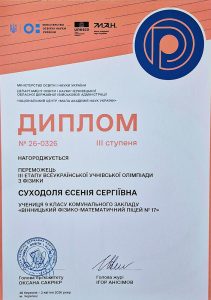 | 2 | Суходоля Єсенія Сергіївна | 9 | ІІІ | Семенюк Костянтин Васильович |
