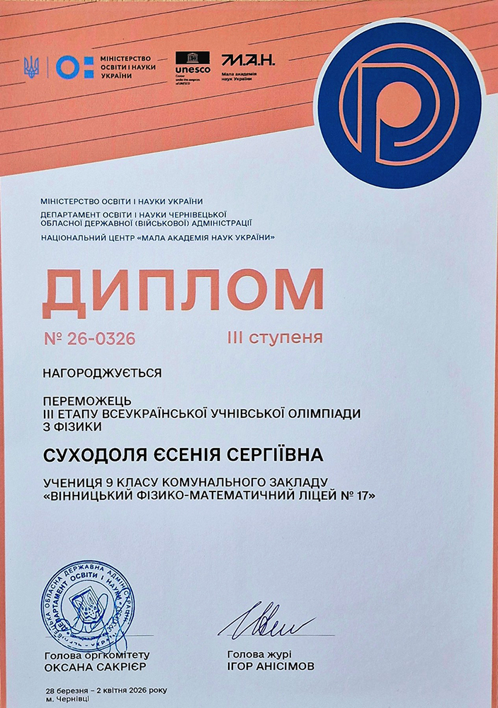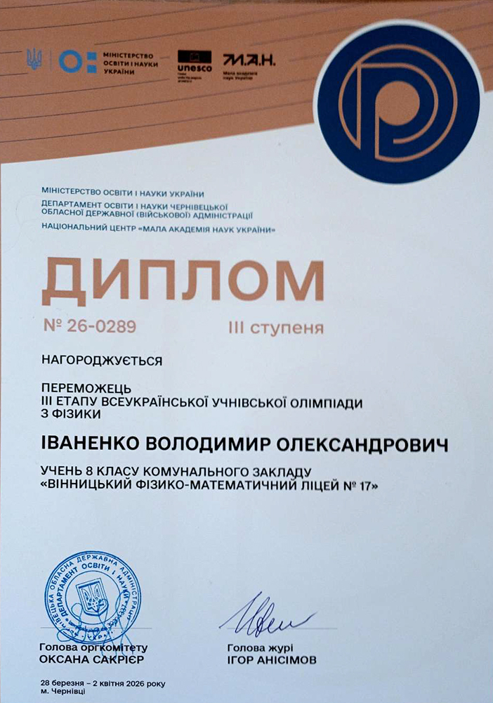 28 березня – 2 квітня 2026 року в Чернівцях відбувся фінал Всеукраїнської учнівської олімпіади з фізики.