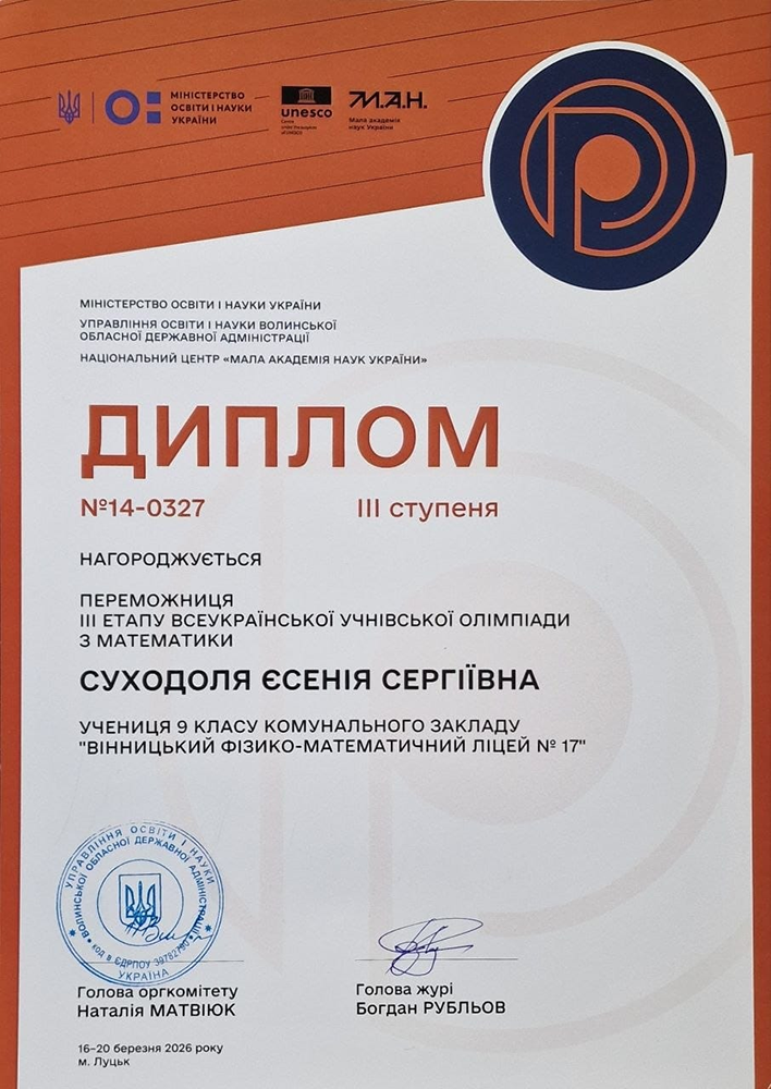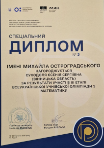 Суходоля Єсенія також була нагороджена спеціальним дипломом імені Михайла Остроградського.