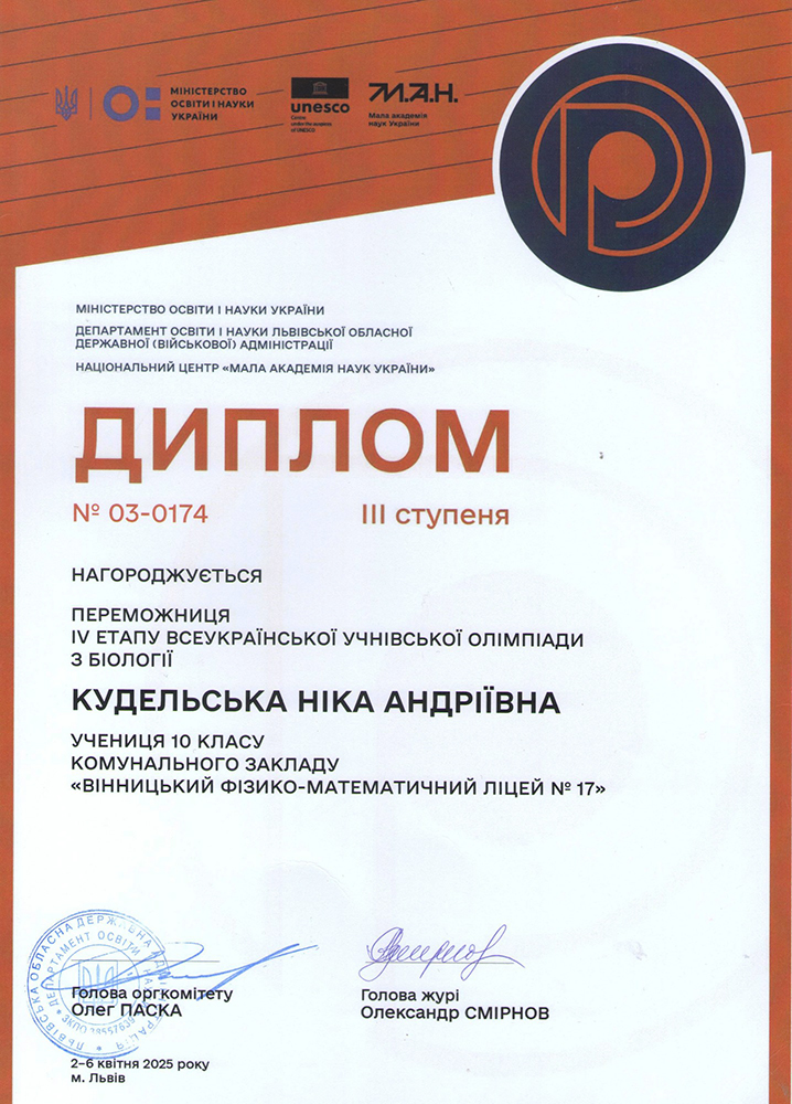 | 1 | Кудельська Ніка Андріївна | 10 | ІІІ | Пльонсак Тетяна Миколаївна |