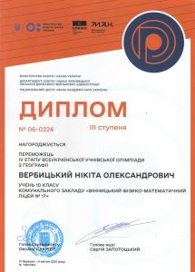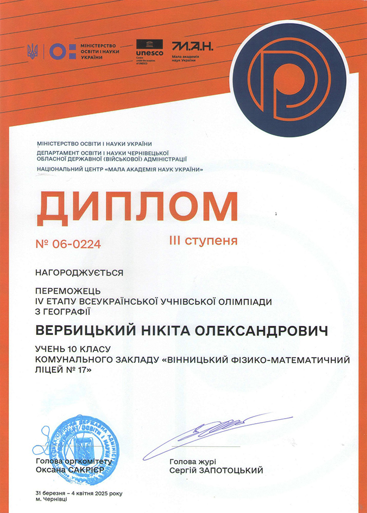 | 1 | Вербицький Нікіта Олександрович | 10 | ІІІ | Коршак Алла Анатоліївна |
