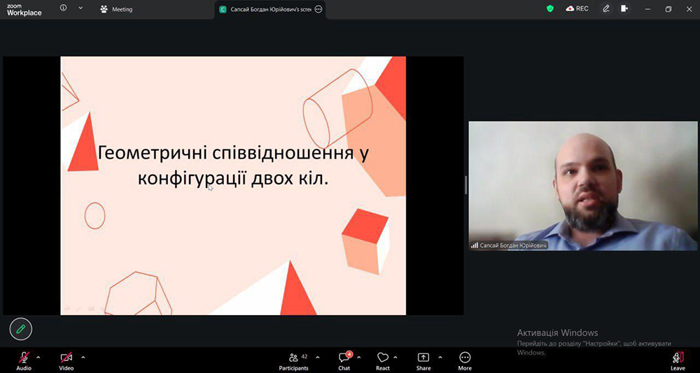 Вчитель математики ВФМЛ №17 Сапсай Богдан Юрійович вже традиційно виступив у ролі спікера та поділився з колегами своїми здобутками на тему “Геометричні співвідношення у конфігурації двох кіл”.