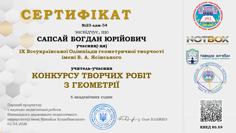 | Воєвода Вероніка Русланівна | 9-В | ІІ | Застосування методів проективної геометрії до узагальнення теореми про циклічність чотирьох точок | Сапсай Богдан Юрійович |