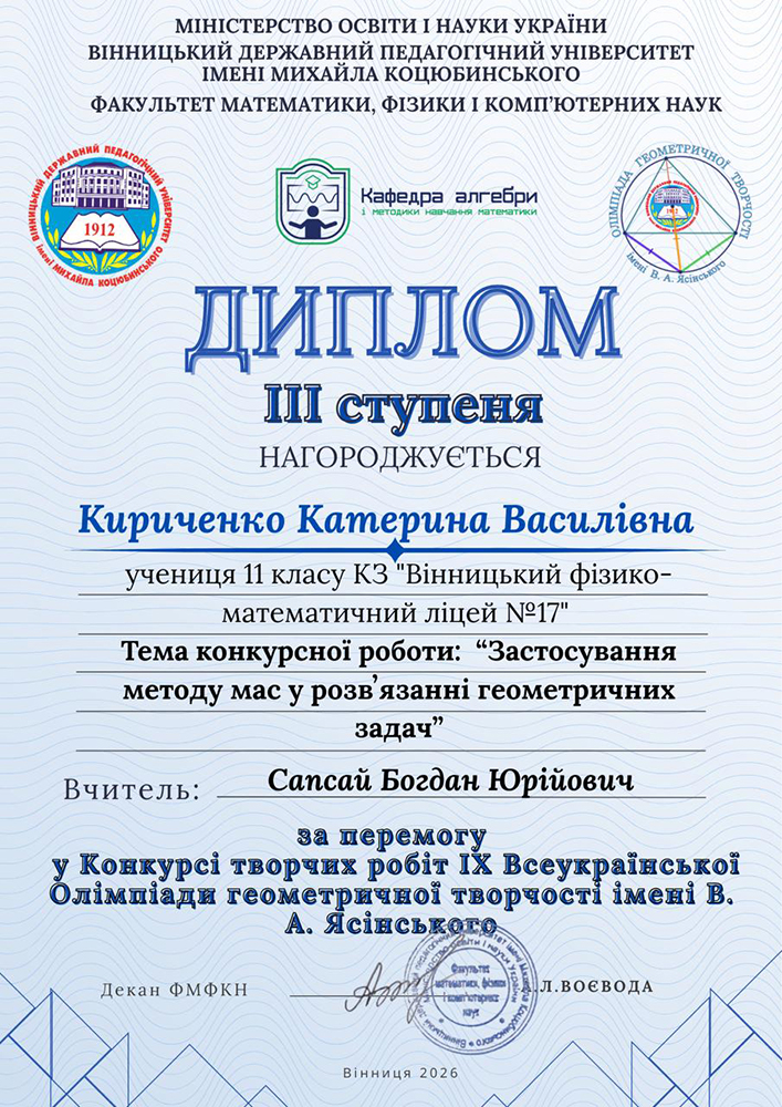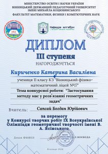 | Кириченко Катерина Василівна | 11-Б | ІІІ | Застосування методу мас у розв’язування геометричних задач | Сапсай Богдан Юрійович |