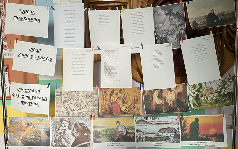 1. На другому поверсі ліцею демонструвалась виставка малюнків та ілюстрацій до творів поета, а також виставка власних віршів, присвячених творчості Т. Г. Шевченка (вчитель Дячук О.В.).