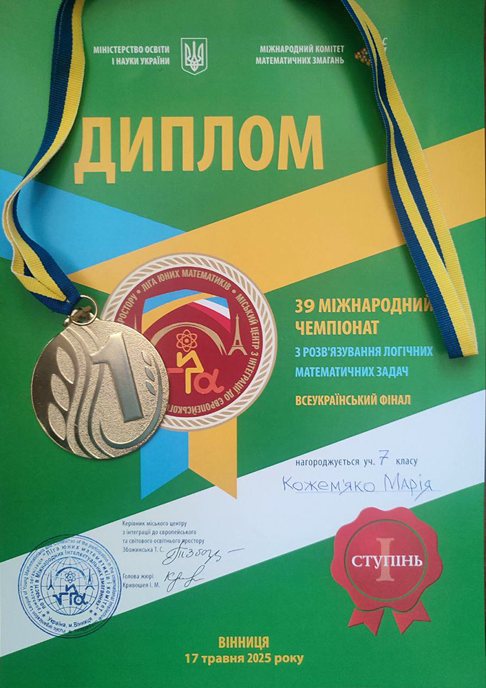 | 1 | Кожем’яко Марія Андріївна | 7-Б | золота | 1 |