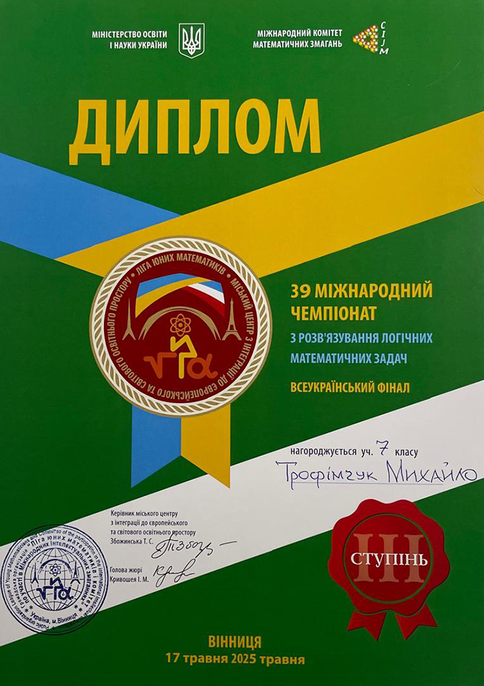 | 3 | Трофімчук Михайло Андрійович | 7-А | бронзова | 3 |