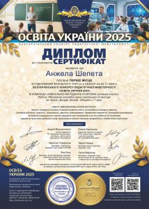 За підсумками 2 сезону Всеукраїнського конкурсу педагогічної майстерності “Освіта України 2025” вчитель української мови та літератури Шепета Анжела Володимирівна посіла І місце.